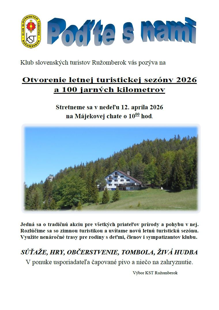 Klub slovenských turistov Ružomberok vás pozýva v nedeľu 12. apríla 2026 na Otvorenie letnej turistickej sezóny 2026 a akcie 100 jarných kilometrov.